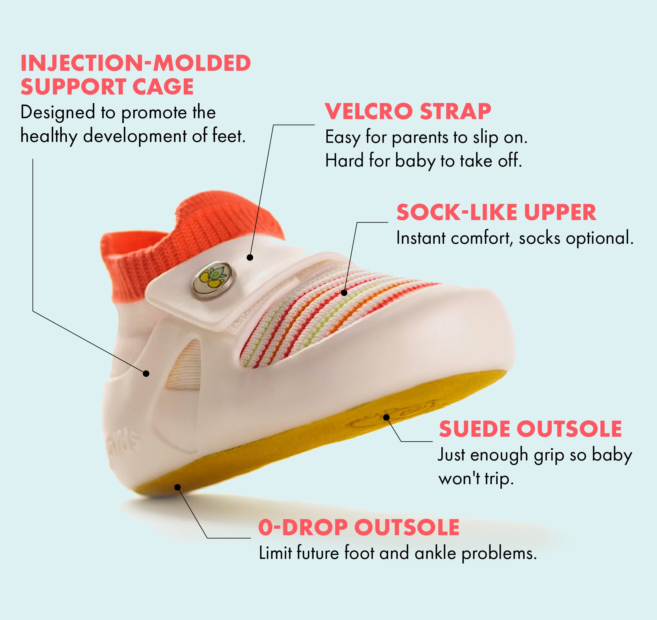 Historically, the footwear industry has been shrinking shoes designed for adult feet to fit kids’ feet, even though their feet are still developing. Infants don’t have arches nor the structural stabilization to bear weight and stand.