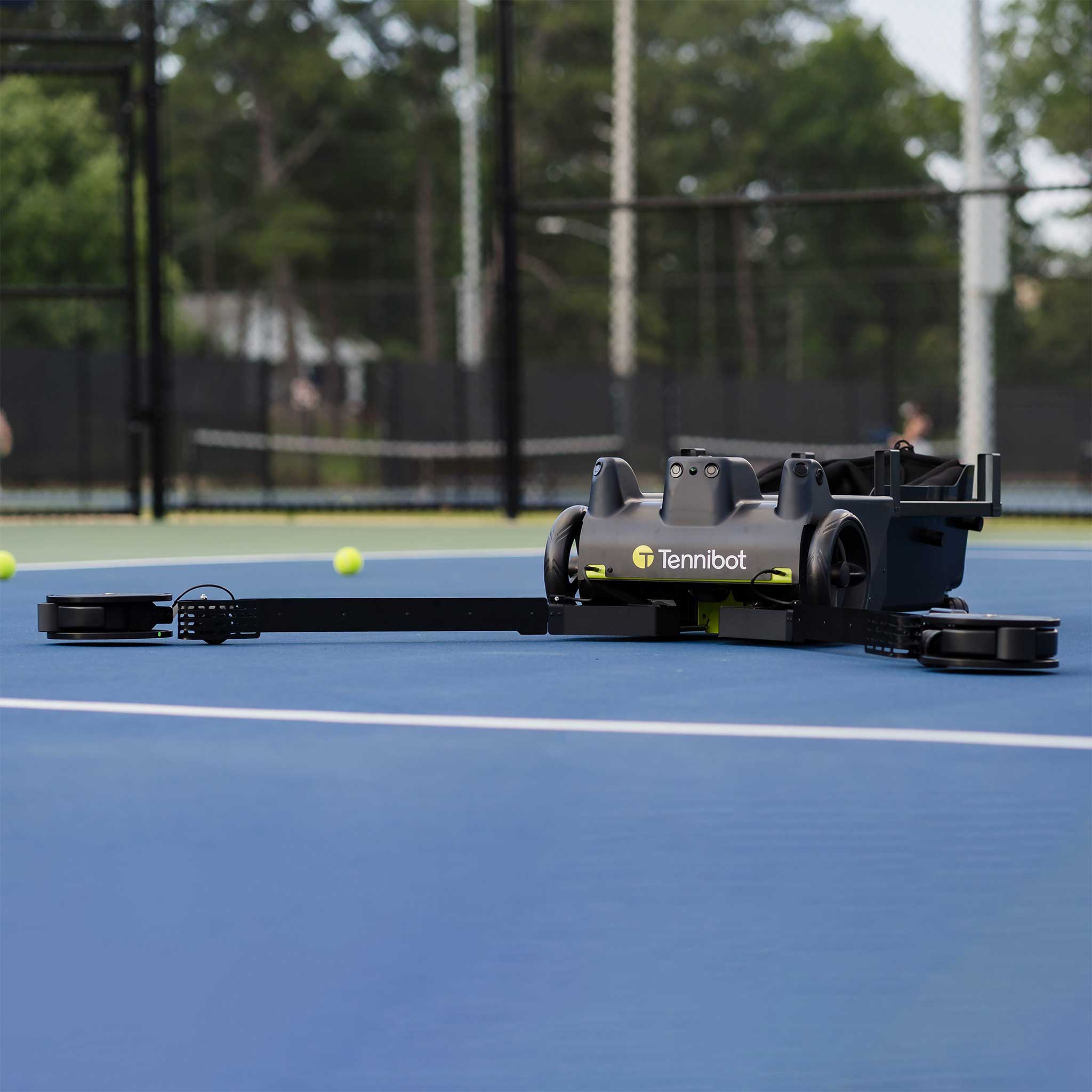 Tennis, meet Robot. Introducing the Tennibot Tennis Retrieval System, the world's first robotic tennis ball collector. Perfect for clubs, players and coaches, the Tennibot helps you spend more time playing and less time collecting tennis balls. It autonomously patrols the courts and gathers the balls you lobbed, smashed, or mis-hit. When it's time to head home, the Tennibot easily folds and lets you roll the device back to your car like a suitcase. You can also manually control Tennibot through the app to easily maneuver it on and off the court. Whether you're practicing serves, volleys or groundstrokes, the Tennibot Tennis Retrieval System clears the court while you step up your game!