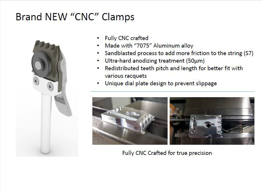 - True Precision CNC crafted universal clamps made with "7075" Aluminum Alloy, the strongest of its class. Sandblasted process and ultra-hard anodizing treatment add more friction to the string. Redistributed teeth pitch and length for better fit with various racquets. Unique dial plate design prevents slippage.