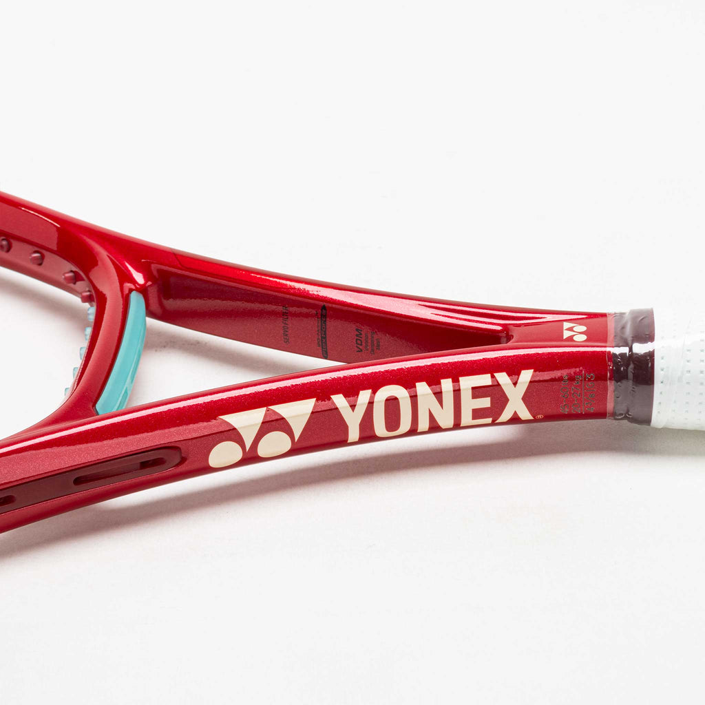 Introducing the Yonex VCORE 100 300g Ruby Red! This spin-friendly tennis racquet helps you dictate the pace of play. Swing with ease and smooth motion with the improved aerodynamic frame. NAMD™ graphite maintains flexibility during fast swings to maximize snap back. The extended tapered inner frame creates a bigger sweet spot, providing more forgiveness on off-center hits. Designed to keep your opponents guessing, the Yonex VCORE 100 300g Ruby Red is a spin-friendly weapon!